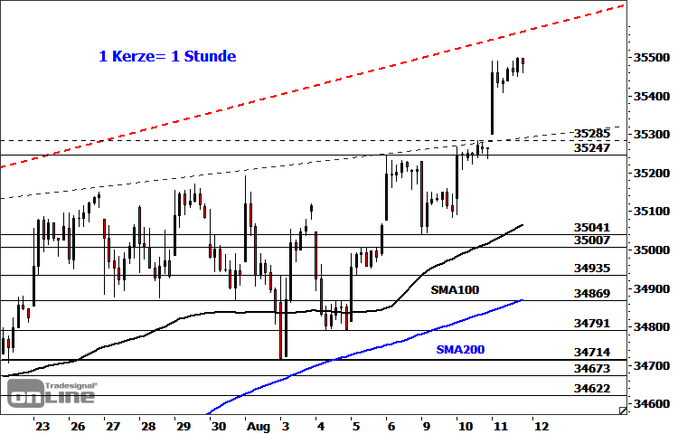 Der charttechnische Fokus richtet sich nun auf den nächsten Ziel- und Widerstandsbereich bei 35.560-35.605 Punkten. Dort würde der Übergang in eine kurzfristige Verschnaufpause nicht überraschen. Ein nachhaltiger Anstieg darüber per Stundenschluss könnte die Rally unmittelbar in Richtung 35.670 Punkte oder 35.787-35.923 Punkte ausdehnen. Mit Blick auf die Unterseite verfügt der Index über eine nächste Unterstützungszone bei 35.247-35.301 Punkten. solange diese nicht nachhaltig unterschritten wird, bleiben die Bullen im kurzfristigen Zeitfenster in einer starken Position. Darunter würde ein deutlicherer Rücksetzer in Richtung zunächst 35.041-35.090 Punkte wahrscheinlich. Weitere potenzielle Auffangbereiche lauten in diesem Fall 34.869-34.900 Punkte und 34.714-34.791 Punkte. Unterhalb der letztgenannten Zone müsste der Übergang in eine mittelfristige Korrekturphase mit möglichen Zielen bei aktuell 34.300 Punkten, 33.742 Punkten und 33.272 Punkten eingeplant werden.
