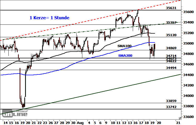 Um eine weitere Eintrübung der technischen Ausgangslage zu verhindern, müssen die Bullen den aktuellen Supportbereich bei 34.673-34.714 Punkten vereidigen. Oberhalb dieser Zone könnte sich die Erholungsbewegung vom gestrigen Tief heute in Richtung 35.015 Punkte und eventuell 35.090-35.188 Punkte ausdehnen. Oberhalb der letztgenannten Zone käme es zu einer leichten Aufhellung der Lage zugunsten der Bullen mit potenziellen Zielen und Hürden bei 35.357 Punkten und 35.560-35.631 Punkten. Ein signifikanter Rutsch unter 34.673 Punkte würde hingegen für eine deutliche preisliche und zeitliche Ausdehnung der laufenden Abwärtskorrektur des dominanten Aufwärtstrends sprechen. In diesem Fall lauten die nächsten möglichen Ziele und Unterstützungen 34.622 Punkte und 34.464/34.494 Punkte. Die mittelfristige Aufwärtstrendlinie verläuft aktuell bei 34.297 Punkten. Darunter würden Ziele bei 33.742 Punkten und 33.272 Punkten aktiviert.