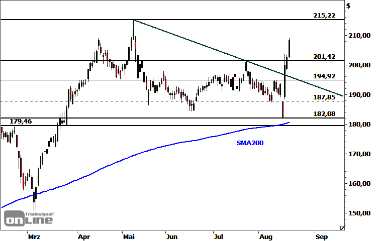 Die Aktie des Baumarktbetreibers Lowe’s (WKN: 859545) bewegt sich in einem intakten langfristigen Aufwärtstrend. Vom Corona-Crash-Tief im März 2020 bi 60,00 USD konnte der Wert in der Spitze um 259 Prozent zulegen. Nach dem Markieren eines Rekordhochs bei 215,22 USD im Mai startete eine Korrekturphase. Knapp oberhalb der steigenden 200-Tage-Linie verzeichnete das Papier in der vergangenen Woche ein Korrekturtief bei 182,08 USD. In Reaktion auf besser als erwartete Quartalszahlen und einen über der Konsensschätzung liegenden Umsatz-Ausblick drehte der Kurs unmittelbar in den Bullenmodus und überwand am Mittwoch dynamisch die korrektive Abwärtstrendlinie sowie am Donnerstag das Reaktionshoch bei 201,42 USD. Diese bullishen Signale wurden mit weiteren deutlichen Zugewinnen auf ein 3-Monats-Hoch am Freitag bestätigt. Im charttechnischen Fokus als nächstes potenzielles Kursziel steht nun das Rekordhoch bei 215,22 USD. Mit einem nachhaltigen Anstieg darüber würden als Nächstes die Fibonacci-Extensionsziele bei 224,23/227,88 USD sowie 235,70 USD in den Blick rücken. Mögliche Auffangbereiche für den Fall eines Rücksetzers befinden sich bei 201,42 USD und vor allem 193,14-195,85 USD. Solange die letztgenannte Zone nicht signifikant unterboten wird, bleiben die Bullen am Ruder. Darunter wären ein Schließen der Lücke bei 187,85 USD und ein Wiedersehen mit der übergeordnet kritischen Supportzone bei 179,46-182,08 USD einzuplanen.