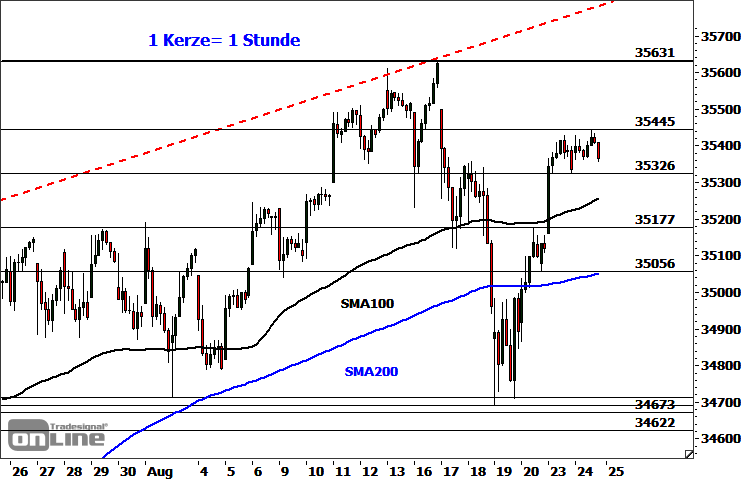 Mit Blick auf den Stundenchart befindet sich die Notierung in einer Seitwärts-Konsolidierung der jüngsten Rally. Das ganz kurzfristige Bild ist neutral zu werten. Übergeordnet bleiben die Bullen am Ball, solange die Supportzone bei 34.990-35.077 Punkten nicht signifikant unterschritten wird. Ein Rutsch unter den aktuellen Support bei 35.226 Punkten würde auf einen weitergehenden Rücksetzer in Richtung 35.257/35.272 Punkte und eventuell 35.164-35.177 Punkte hinweisen. Ein Anstieg über die aktuelle Hürde bei 35.445 Punkten würde hingegen eine unmittelbare Rally-Fortsetzung in Richtung 35.560-35.631 Punkte ermöglichen. Ein signifikanter Anstieg über das Rekordhoch bei 35.631 Punkten würde schließlich das Fibonacci-Ausdehnungsziel bei 35.787 Punkten in den charttechnischen Fokus rücken.