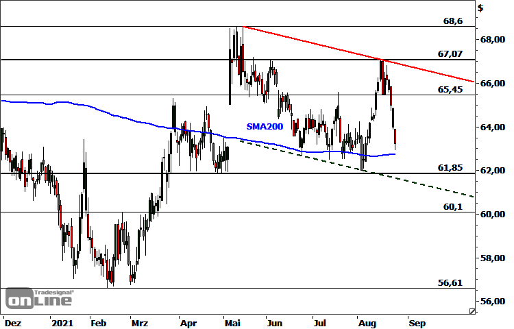 Die Aktie des Lebensmittelkonzerns Kellogg (WKN: 853265) hatte im Jahr 2016 nach dem Markieren eines Rekordhochs bei 87,16 USD einen zyklischen Bärenmarkt gestartet. Nach dem Erreichen eines Tiefs bei 51,34 USD im Jahr 2019 konnte sie sich im Rahmen von zwei Aufwärtswellen bis auf 72,88 USD erholen. Ein erneuter Abschwung endete bei 56,61 USD, wo im Februar/März dieses Jahres ein Doppelboden zur Etablierung eines weiterhin intakten mittelfristigen Aufwärtstrends führte. Seit einem im Mai verzeichneten Rallyhoch bei 68,60 USD korrigiert der Wert diesen Aufwärtstrend und schickt sich aktuell an, die im Rahmen der Korrekturphase im Fokus stehende Unterstützung der 200-Tage-Linie bei derzeit 62,72 USD im Rahmen eines Pullbacks erneut zu testen. Kann sich die Notierung in den kommenden Handelstagen darüber stabilisieren, könnte sich hier eine antizyklische Long-Chance ergeben. Eine preisliche Bestätigung für eine zeitnahe Attacke auf die mittelfristig kritische Widerstandszone bei 66,82-67,07 USD entstünde, falls die beiden nächsten Widerstandsthemen und potenziellen Erholungsziele bei 64,00/64,05 USD und 64,46 USD per Tagesschluss überwunden werden können. Oberhalb von 67,07 USD würden die Bereiche 68,80/69,04 USD und 71,65/72,88 USD als mögliche Ziele aktiviert. Setzt sich hingegen der aktuelle dynamische Abverkauf bis unter die 200-Tage-Linie per Tagesschluss fort, würden zunächst die Zonen 61,19-62,00 USD und 60,00-60,62 USD als potenzielle Abwärtsziele in den charttechnischen Fokus rücken. Unterhalb der letztgenannten Zone wäre schließlich ein mittelfristiges Wiedersehen mit dem Jahrestief bei 56,61 USD zu favorisieren.