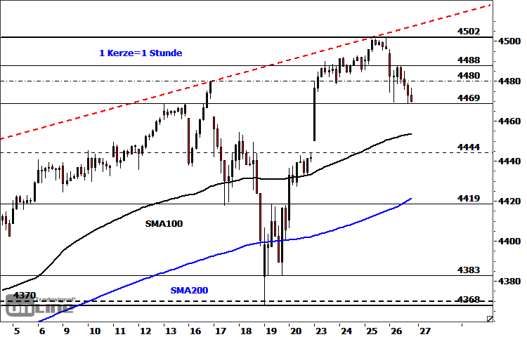 Der Index befindet sich nun im Konsolidierungsmodus im Rahmen des übergeordneten Aufwärtstrends. Ein Rutsch unter den aktuellen Support bei 4.469/4.470 Punkten würde mit Blick auf den Stundenchart für eine deutlichere Abwärtskorrektur in Richtung 4.444-4.454 Punkte und eventuell 4.419-4.422 Punkte sprechen. Unterhalb der letztgenannten Zone würden die Bären den kurzfristigen technischen Vorteil erhalten und es wäre ein ernsthafter Test der mittelfristig kritischen Supportzone bei aktuell 4.368-4.378 Punkten zu favorisieren. Mit Blick auf die Oberseite verfügt der Index über nächste Widerstände bei 4.488 Punkten und 4.500/4.502 Punkten. Darüber dürfte sich die Rally unmittelbar ausdehnen bis an die nächsten Ziele bei 4.511 Punkten und eventuell 4.523 Punkten.