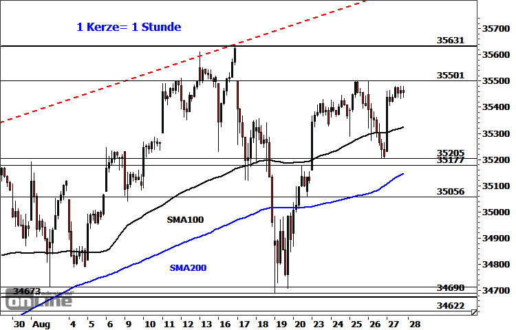 Der Index konsolidiert nun den Kursschub knapp unterhalb des Wochenhochs. Die Bullen bleiben in einer starken Position für ein zeitnahes Wiedersehen mit dem Rekordhoch (35.631), solange die Supportzone bei 35.177-35.205 Punkten von ihnen verteidigt werden kann. Darüber fungiert bereits die 100-Stunden-Linie bei derzeit 35.324 Punkten als mögliche Unterstützung. Ein Break über die aktuelle Hürde bei 35.501 Punkten würde bereits die Zone 35.560-35.631 Punkte in den Fokus rücken. Darüber würde schließlich der primäre Aufwärtstrend bestätigt mit nächsten potenziellen Zielen bei 35.787 Punkten und 35.850-35.923 Punkten. Unterhalb von 35.177 Punkten entstünden hingegen Abwärtsrisiken in Richtung zunächst 35.012/35.056 Punkte. Die Verletzung der letztgenannten Zone würde das Chartbild deutlicher trüben und die steigende 50-Tage-Linie bei derzeit 34.842 Punkten sowie die kurzfristig kritische Unterstützungszone bei 34.673-34.714 Punkten als mögliche Ziele aktivieren.