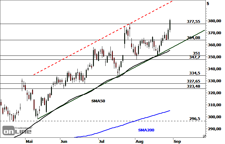 Die Facebook-Aktie (WKN: A1JWVX) bewegt sich in einem intakten Aufwärtstrend. Seit Jahresbeginn konnte sie bereits um rund 39 Prozent zulegen. Zuletzt hatte das Papier nach dem Markieren eines Allzeithochs bei 377,55 USD eine mehrwöchige Konsolidierungsphase durchlaufen. Nach einem erfolgreichen Test des Supportclusters aus mittelfristiger Trendlinie und 50-Tage-Linie am 19. August startete ein dynamischer Kursschub, der die Notierung im gestrigen Handel schließlich über das Juli-Hoch auf eine neue historische Bestmarke bei 381,49 USD beförderte. Im Rahmen des damit bestätigten primären Aufwärtstrends lassen sich nächste potenzielle Kurzfrist-Ziele bei 385,67/386,53 USD und 394,05-396,00 USD ausmachen. Mittelfristig erscheint ein Vorstoß in Richtung 408/412 USD möglich. Zur Aufrechterhaltung dieses bullishen Szenarios sollte die kritische Supportzonebei aktuell 351,00-357,68 USD nicht unterschritten werden. Darüber befindet sich bereits eine mögliche Auffangregion bei 364/365 USD. Unterhalb von 351,00 USD wäre der Übergang in eine mittelfristige Korrekturphase zu favorisieren.