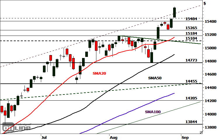 Der Nasdaq 100 konnte am Freitag und Montag seinen Aufwärtstrend dynamisch fortsetzen und brach dabei zunächst über das Konsolidierungshoch bei 15.404 Punkten und zuletzt über die Rückkehrlinie des mittelfristigen Trendkanals bis auf ein neues Allzeithoch bei 15.621 Punkten aus.