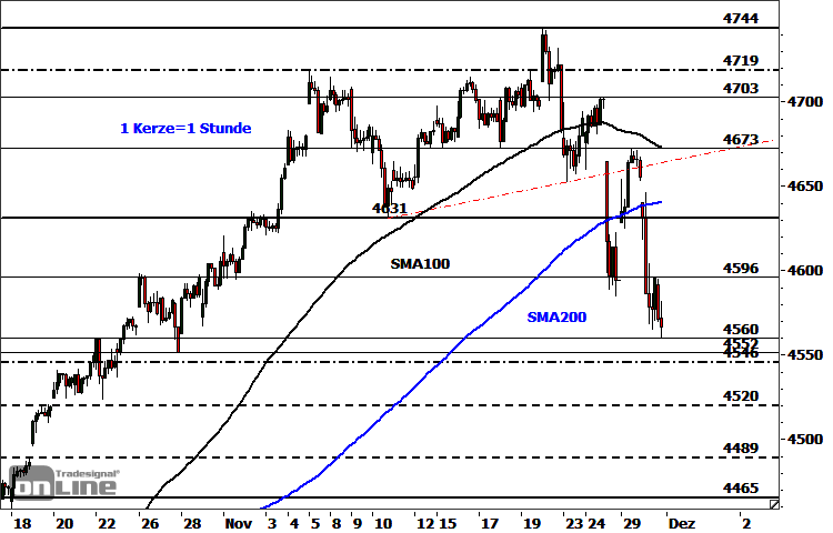 Das erreichte 38,2%-Fibonacci-Retracement (4.566) und die kurzfristig überverkauften sowie positiv divergierenden markttechnischen Indikatoren ermöglichen eine deutlichere Erholungsbewegung. Vorbörslich wird der Index freundlich erwartet. Im Blick steht die Widerstandsregion 4.596/4.603 Punkte. Ein Stundenschluss darüber würde Aufwärtspotenzial in Richtung 4.619 Punkte und 4.630-4.641 Punkte freisetzen. Zur Machtübernahme durch die Bullen im kurzfristigen Zeitfenster bedarf es der nachhaltigen Herausnahme der darüber befindlichen Hürde bei 4.652-4.674 Punkten per Tagesschluss. Unterhalb von 4.560 Punkten wäre eine unmittelbare Fortsetzung des Abverkaufs in Richtung 4.546-4.552 Punkte und 4.511-4.524 Punkte zu favorisieren.