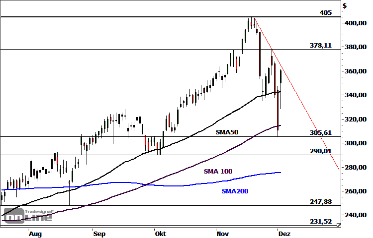 Die Aktie des im vergangenen Jahr an die Börse gegangenen Anbieters von Cloudsoftware Snowflake Inc (WKN: A2QB38) bewegt sich ausgehend vom im Mai bei 184,71 USD markierten Korrekturtief in einem intakten Aufwärtstrend. Mit dem jüngsten Rallyhoch bei 405,00 USD näherte sich das Papier der im vergangenen Dezember verzeichneten Bestmarke von 429,00 USD deutlich an. Die dort gestartete Abwärtskorrektur verlief bislang dreiwellig und führte den Anteilsschein bis auf das 100%-Projektionsniveau der ersten Abwärtswelle sowie die steigende 100-Tage-Linie zurück. Im gestrigen Handel konnte er sich deutlich vom Korrekturtief bei 305,61 USD absetzen und schloss mit einem Aufschlag von 15,85 Prozent, das stärkste Tagesplus seit vergangenem Dezember. Auslöser waren positiv aufgenommene Quartalszahlen und ein starker Umsatzausblick. Die Aktie sieht sich nun dem kritischen Widerstandsbereich 365,00-378,11 USD gegenüber. Ein Tagesschluss darüber würde einen ersten prozyklischen Hinweis auf eine Fortsetzung des dominanten Aufwärtstrends liefern. Potenzielle nächste Kursziele lauten im Erfolgsfall 405,00 USD und 429,00/432,03 USD. Darüber befinden sich Extensionsziele bei 442,97 USD und 466,42 USD. Nächste Unterstützungen lauten 328,61 USD und 305,61-315,07 USD. Darunter wäre eine Fortsetzung der Abwärtskorrektur in Richtung 290,01/294,86 USD und eventuell 264,93-275,65 USD zu favorisieren.
