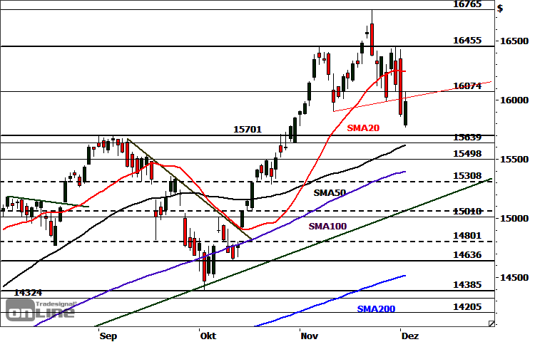 Der Nasdaq 100 setzte ausgehend vom Reaktionshoch bei 16.455 Punkten seinen am Rekordhoch gestarteten korrektiven Abwärtstrend fort und rutschte bis auf ein im gestrigen Handel markiertes 5-Wochen-Tief bei 15.771 Punkten. dort setzte eine Erholungsbewegung ein, die die Notierung bis auf 16.066 Punkten hinaufführte.