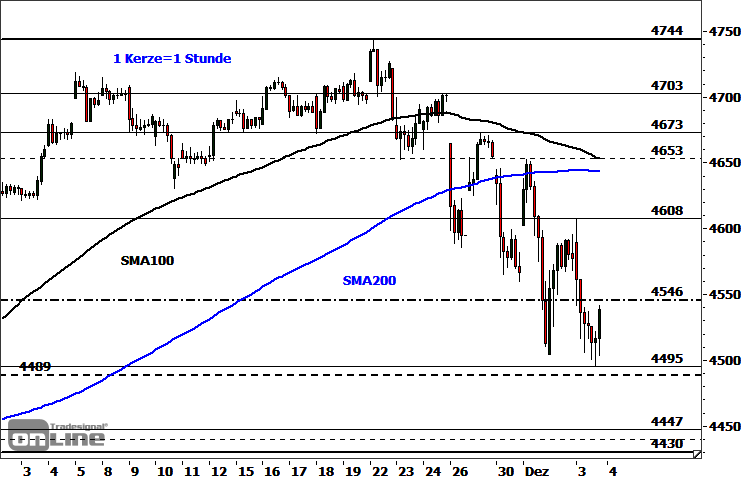 Kurzfristig besteht eine gute Chance auf eine technische Erholungsbewegung in Richtung 4.590/4.608 Punkte. Bestätigend hierfür wäre ein nachhaltiger Break über den aktuellen Widerstand bei 4.546/4.554 Punkten. Oberhalb von 4.608 Punkten könnte sich die Rally zügig in Richtung 4.619 Punkte und 4.631-4.673 Punkte ausdehnen. Erst darüber entstünde ein prozyklisches Indiz für ein mögliches Ende des übergeordneten Abwärtstrends. Eine Verletzung des aktuellen Supportbereichs 4.485-4.511 Punkte würde hingegen für eine unmittelbare Fortsetzung der Abwärtskorrektur in Richtung zunächst 4.465 Punkte und 4.428-4.447 Punkte sprechen.