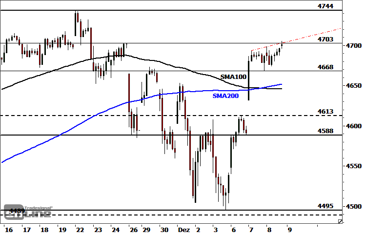 Ganz kurzfristig betrachtet besteht eine erhöhte Wahrscheinlichkeit für eine Verschnaufpause. Neben dem Momentum-Verlust auf Basis des Stundencharts sprechen das erreichte Widerstandscluster bei aktuell 4.703 Punkten und die dort geformte Spinning-Top-Kerze für eine solche Konsolidierung. Nächste Unterstützungen liegen bei 4.668/4.679 Punkten und 4.646-4.656 Punkten. Kann der Index die letztgenannte Zone per Stundenschluss verteidigen, bleiben die Bullen in einer starken Position. Darunter wäre eine deutlichere Korrektur in Richtung 4.625 Punkte, 4.600/4.613 Punkte und 4.588 Punkte einzuplanen. Ein Stundenschluss oberhalb der aktuellen Hürde bei 4.703/4.705 Punkten würde eine unmittelbare Fortsetzung des Aufschwungs in Richtung zunächst 4.722/4.727 Punkte und 4.744 Punkte signalisieren.