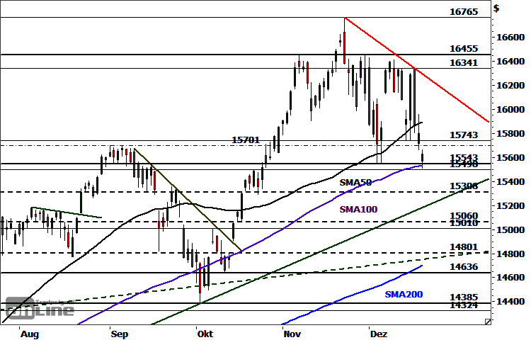 Der Nasdaq 100 rutschte am Freitag unter die zuvor unterstützende 50-Tage-Linie und setzte seine Kursschwäche bis auf ein gestern verzeichnetes 2-Monats-Tief bei 15.509 Punkten fort. Dank einer Erholung im späten Handel konnte der Index oberhalb der intraday unterschrittenen 100-Tage-Linie und des bisherigen Korrekturtiefs vom 3. Dezember (15.543) schließen.