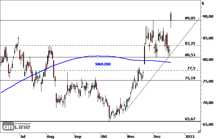 Die Aktie des Chipkonzerns Micron Technology (WKN: 869020) bewegt sich in einem langfristigen Aufwärtstrend. Vom Tief im März 2020 bei 31,13 USD konnte sie in drei Wellen bis auf ein im April dieses Jahres verzeichnetes Dekadenhoch bei 96,96 USD ansteigen. Im Rahmen der anschließenden Abwärtskorrektur ging es für das Papier bis auf 65,67 USD abwärts. Dort meldeten sich im Oktober die Bullen zurück. Der etablierte Aufwärtstrend wurde zuletzt unterhalb des Rallyhochs bei 89,05 USD und oberhalb der zurückeroberten 200-Tage-Linie auskonsolidiert. Im gestrigen Handel löste der Wert schließlich die Konsolidierung in Reaktion auf die Veröffentlichung positiv aufgenommener Quartalszahlen nach oben auf und stieß bis auf ein 8-Monats-Hoch vor. Die Bullen bleiben im Vorteil, solange die Supportzone bei 80,53-83,25 USD nicht unterschritten wird. Nächste potenzielle Kursziele befinden sich bei 91,37 USD, 92,30 USD, 94,32 USD und 96,96/97,57 USD. Darüber (Wochenschluss) würde der langfristige Aufwärtstrend bestätigt mit nächstem Ziel 105-109 USD.