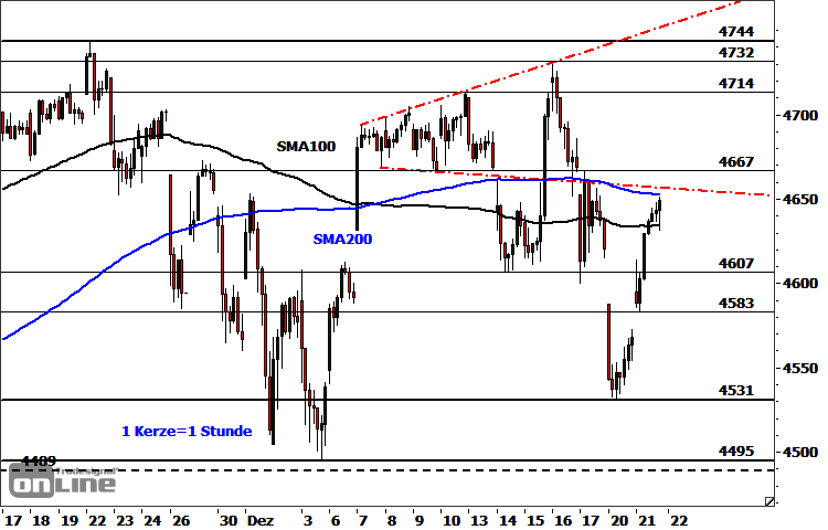 Der Index verbleibt mittelfristig betrachtet in einer volatilen Seitwärtskorrektur unterhalb des Rekordhochs bei 4.744 Punkten und oberhalb des Korrekturtiefs bei 4.495 Punkten. Kurzfristig gesehen konnten die Bullen mit der gestrigen Rückeroberung der steigenden 50-Tage-Linie sowie 20-Tage-Linie einen Achtungserfolg erzielen. Um weiteres Anschlusspotenzial zu generieren muss nun jedoch die aktuelle Widerstandszone bei 4.653-4.667 Punkten aus dem Weg geräumt werden. Im Erfolgsfall könnte der Index zeitnah erneut die übergeordnet kritische Widerstandszone bei 4.732/4.744 Punkten testen. Deren nachhaltige Überwindung per Tagesschluss würde schließlich den intakten langfristigen Bullenmarkt bestätigen. Nächste Unterstützungen lauten 4.632/4.635 Punkte und 4.605/4.607 Punkte. Darunter würde sich das kurzfristige Bild bereits wieder eintrüben mit möglichen nächsten Zielen auf Auffangbereichen bei 4.583 Punkten und 4.531 Punkten.