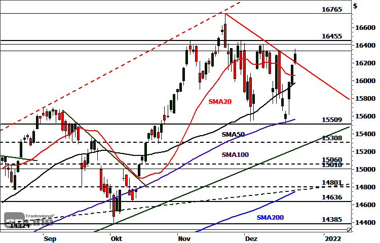 Die Bullen proben nun den Ausbruch über die darüber befindliche horizontale Widerstandszone bei 16.341-16.455 Punkten. Ein ernsthaftes Ausloten dieser Hürde ist zeitnah wahrscheinlich. Ein Tagesschluss darüber wäre bullish zu werten mit nächstem Primärziel bei 16.765 Punkten (Rekordhoch). Mit Blick auf die Unterseite verfügt der Index über einen nächsten Supportbereich bei 15.982/16.062 Punkten. Solange dieser nicht per Tagesschluss unterboten wird, bleiben die Bullen in einer starken Position. Darunter wäre zunächst ein Test der kritischen Unterstützungszone bei 15.509-15.600 Punkten zu favorisieren.