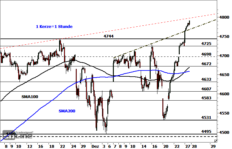 Das Anschlusskaufsignal bestätigte den dominanten Bullenmarkt. Im „Uncharted Territory“ lassen sich naturgemäß keine historischen Hürden ableiten. Aus ansteigenden Widerstandslinien entlang vergangener Hochpunkte sowie aus Fibonacci-Marken ergeben sich jedoch potenzielle nächste Hürden und Ziele bei 4.799/4.800 Punkten, 4.811/4.813 Punkten und 4.839 Punkten. Darüber (Tagesschlusskursbasis) wäre eine unmittelbare Ausdehnung der Rally in Richtung 4.898/4.900 Punkte vorstellbar. Unterstützt ist der Index als Nächstes bei 4.768/4.776 Punkten. Ein Stundenschluss darunter würde ein Warnsignal für einen möglichen Pullback an das Ausbruchsniveau bei 4.744 Punkten liefern. Deutlicher eintrüben würde sich das ganz kurzfristige Bild unterhalb von 4.725 Punkten. In diesem Fall müssten fortgesetzte Abgaben in Richtung 4.698 Punkte und eventuell 4.659-4.672 Punkte eingeplant werden.