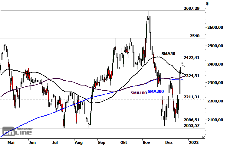 Die Aktie des Online-Reisevermittlers Booking Holdings (WKN: A2JEXP) bewegt sich in einem intakten langfristigen Aufwärtstrend. Mittelfristig etablierte sie eine Handelsspanne unterhalb des im November verzeichneten Rekordhochs bei 2.687 USD und oberhalb der Supportzone bei 2.054-2.087 USD. Mit Blick auf das kurzfristige Chartbild konnte der Wert zuletzt einen Boden über der genannten Unterstützung ausbilden und dynamisch über die wichtige Widerstandszone bei 2.314-2.347 USD ansteigen, die nun als potenzielle Unterstützung fungiert. Nach einem Rallyhoch bei 2.422 USD ging der Anteilsschein in den vergangenen drei Handelstagen in den Konsolidierungsmodus über. Solange er sich per Tagesschluss über 2.314 Punkten halten kann, bleiben die Bullen in einer guten Ausgangslage für eine Ausdehnung des kurzfristigen Aufwärtstrends. Mögliche Ausdehnungsziele lauten 2.447 USD und 2.516-2.540 USD. Darüber würde das November-Hoch in den charttechnischen Fokus rücken. Unterhalb von 2.314 USD müsste hingegen ein Rücksetzer in Richtung 2.211-2.241 USD eingeplant werden. Die Bären würden erst im Falle einer nachhaltigen Verletzung der kritischen Unterstützungszone bei 2.054-2.087 USD das Ruder übernehmen. In diesem Fall entstünden Abwärtsrisiken in Richtung 1.796-1.861 USD und 1.589 USD.