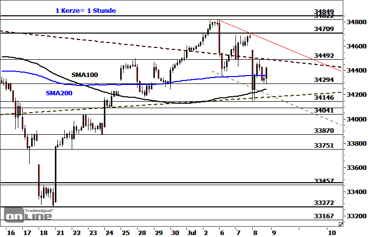 Das klassische Ziel einer dreiwelligen abc-Korrektur wurde mit dem gesehenen Tief abgearbeitet. Das geringfügige Unterschreiten und anschließende dynamische Zurückerobern des dort befindlichen Unterstützungsclusters sind kurzfristig positiv zu werten. Um ein vertrauenswürdiges prozyklisches Indiz für ein mögliches Ende der Abwärtskorrektur zu erhalten, müsste jedoch die korrektive Abwärtstrendlinie bei derzeit 34.652 Punkten und das Reaktionshoch bei 34.709 Punkten überwunden werden. Nächster Widerstand befindet sich heute bei 34.492/34.508 Punkten. Darüber (Stundenschlusskursbasis) wäre ein Vorstoß in Richtung zunächst 34.640/34.652 Punkte zu erwarten. Nächste Unterstützungen liegen bei 34.294 Punkten und 34.146-34.245 Punkten. Ein Rutsch unter 34.146 Punkte wäre bearish und würde das Risiko einer Dynamisierung des noch intakten korrektiven Abwärtstrends mit sich bringen. Potenzielle nächste Auffangbereiche lauten dann 34.041/34.048 Punkte und 33.866/33.870 Punkte. Darunter wäre perspektivisch ein fortgesetzter Rutsch in Richtung 33.557 Punkte und 33.232/33.272 Punkten einzuplanen.
