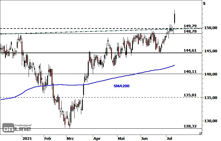 Die Aktie von PepsiCo (WKN: 851995) hatte im März 2020 nach einem crashartigen Ausverkauf ein 2-Jahres-Tief bei 101,42 USD ausgebildet. Seither weist der Trend beim Anteilsschein des Getränkeherstellers wieder übergeordnet aufwärts. Zuletzt rang die Notierung mehrere Tage lang mit der steigenden Widerstandslinie entlang der Hochs vom Februar 2020 und Dezember 2020. In Reaktion auf besser als erwartete Quartalszahlen sprang die Aktie im gestrigen Handel mit einer bullishen Kurslücke und begleitet von hohem Handelsvolumen aus der kurzfristigen Konsolidierung. Sie schraubte sich bis auf neues Rekordhoch bei 153,91 USD hinauf, bevor moderate Gewinnmitnahmen einsetzten. Angesichts der kurzfristig überkauften Situation würde eine Ausdehnung der Verschnaufpause oder ein Pullback in Richtung 149,79-150,69 USD nicht überraschen. Das technische Bild bleibt unmittelbar bullish, solange es nicht zu einem signifikanten Tagesschluss unter 149,79 USD oder einem Rutsch unter 148,78 USD kommt. Als mögliche nächste Kursziele auf der Oberseite fungieren die Fibonacci-Marken 154,33 USD und 156,58 USD. Mittelfristig wäre ein Vorstoß in Richtung 159,65/161,41 USD und eventuell 164,69-165,66 USD vorstellbar. Unterhalb von 148,78 USD wäre hingegen der Eintritt in eine Korrekturphase mit möglichen Auffangbereichen bei 147,20 USD, 144,61 USD und 142,00 USD einzuplanen.