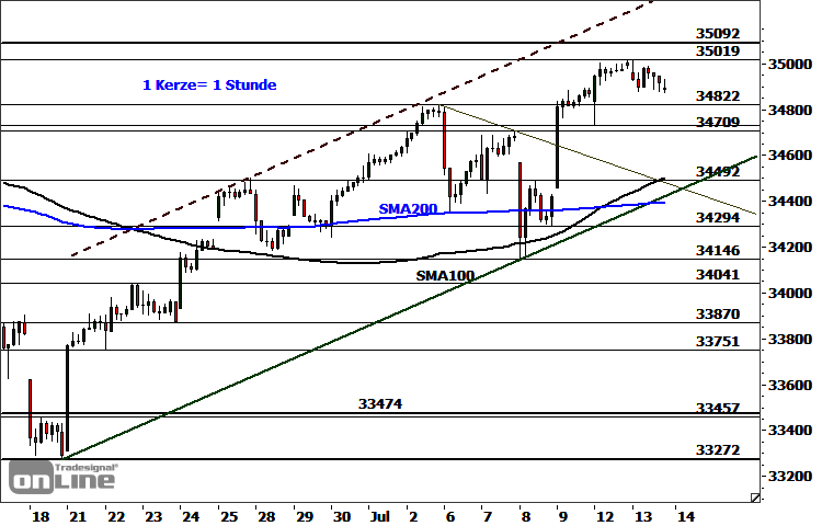Auf Basis des Tagescharts formte der Index eine Bearish-Harami-Kerze. Der Index zeigt damit eine Verschnaufpause knapp unterhalb des Rekordhochs vom Mai (35.092). Der im Intraday-Chart ersichtliche Abwärtstrend vom gestrigen Hoch könnte sich unproblematisch in Richtung 34.813-34.847 Punkte oder 34.685-34.730 Punkte ausdehnen, ohne dass sich das kurzfristige Chartbild signifikant eintrüben würde. Darunter wäre ein ernsthafter Test der kurzfristig kritischen Supportzone bei 34.394-34.508 Punkten einzuplanen. Nächster Widerstand befindet sich heute bei 34.988-35.019 Punkten. Darüber wäre ein zügiger Angriff auf die bedeutendere Hürde bei 35.080/35.092 Punkten zu erwarten. Deren nachhaltige Überwindung würde schließlich den primären Aufwärtstrend bestätigen mit möglichen nächsten Zielen bei 35.201/35.240 Punkten und 35.300-35.350 Punkten.