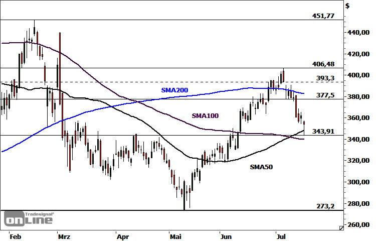 Die Aktie von Zoom Video Communications (WKN: A2PGJ2) hatte als Profiteur der Corona-Pandemie vom Februar 2020 bis zum Oktober 2020 in der Spitze um 668 Prozent zulegen können. Ausgehend vom Rekordhoch bei 588,84 USD ging das Papier anschließend in eine ausgeprägte Korrekturphase über. Das bisherige Korrekturtief sah es im Mai bei 273,20 USD. Die nachfolgende Erholungsrally beförderte den Wert bis auf 406,48 USD. Der damit verbundene Anstieg über die 200-Tage-Linie erwies sich nicht als nachhaltig. Stattdessen geriet der Kurs in den vergangenen beiden Wochen unter Druck und testete gestern die steigende 50-Tage-Linie, die zusammen mit mehreren anderen Unterstützungsthemen ein Supportcluster bildet, das derzeit bis 339,73 USD hinabreicht. Die darauf geformte bullishe Hammer-Kerze im Tageschart signalisiert eine Stabilisierung oder technische Erholung im kurzfristigen Zeitfenster. Mögliche Erholungsziele lassen sich bei 358,61 USD, 367,76 USD und 375,15-382,54 USD ausmachen. Es bedarf eines signifikanten Anstieges über die letztgenannte Zone per Tagesschluss, um ein erstes Signal für eine mögliche Fortsetzung des mittelfristigen Erholungstrends zu erhalten. Zur Aufhellung des übergeordneten Chartbildes bedarf es der nachhaltigen Herausnahme der Hürden bei 406,48 USD und anschließend 445,20/451,77 USD. Eine nachhaltige Verletzung der aktuellen Supportzone per Tagesschluss wäre hingegen als ernster Hinweis für eine mögliche Fortsetzung des noch dominanten Abwärtstrends zu werten. Nächste Unterstützungen und potenzielle Ziele lauten dann 300,00-304,65 USD und 273,20 USD.
