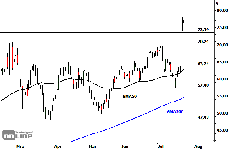 Die Snap-Aktie (WKN: A2DLMS) weist einen langfristigen dynamischen Aufwärtstrend auf. Vom Tief im März 2020 bei 7,89 USD haussierte das Papier bis auf ein Rekordhoch bei 73,59 USD. Dort startete im Februar eine mittelfristige Korrekturphase. Die dabei etablierte Stauzone oberhalb der steigenden 200-Tage-Linie konnte der Anteilsschein nach der Vorlage besser als erwarteter Geschäftszahlen am Freitag mit einer bullishen Ausbruchslücke nach oben verlassen und eine neue Bestmarke bei 79,18 USD setzen. Aus diesem Anschlusskaufsignal lassen sich potenzielle Ziele bei 80,57 USD, 83,40 USD, 89,45 USD und 99,26 USD ableiten. Nächste Unterstützungen liegen bei 73,59 USD und 70,24 USD. Darunter (Tagesschlusskursbasis) käme es zu einer leichten Eintrübung des kurzfristigen Chartbildes und es wäre mit einem Rücksetzer in Richtung 63,74-66,25 USD zu rechnen.