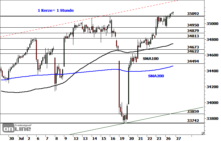 Der übergeordnete Aufwärtstrend wurde damit erneut bestätigt. Vom Ausmaß her kann der erfolgte Ausbruch noch nicht als nachhaltig bezeichnet werden. Die Bullen verfügen im kurzfristigen Zeitfenster dennoch über den technischen Vorteil, solange kein Tagesschluss unter 35.092 Punkte oder Intraday-Rutsch unter 34.950 Punkte erfolgt. Mit Blick auf die Oberseite lassen sich potenzielle nächste potenzielle Ziele und Hürden bei 35.284-35.300 Punkten, 35.457 Punkten und 35.586/35.605 Punkten ausmachen. Ein Rutsch unter das Konsolidierungstief bei 34.950 Punkten würde für einen ausgedehnten Rücksetzer in Richtung zunächst 34.879 Punkte, 34.813/34.818 Punkte und eventuell 34.748 Punkte sprechen.