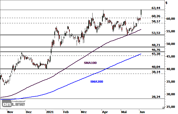 Die Aktie des US-Autobauers General Motors (WKN: A1C9CM) befindet sich ausgehend vom im März 2020 markierten Allzeittief bei 14,32 USD fest in der Hand der Bullen und konnte in der Spitze bereits um rund 345 Prozent zulegen. Im Rahmen einer mehrwöchigen Korrektur fand der Wert im Mai Unterstützung im Bereich der steigenden 100-Tage-Linie. Die dort gestartete Rally gewann zuletzt deutlich an Dynamik. Der im gestrigen Handel erfolgte Kurssprung ließ die Notierung knapp über das Verlaufshoch vom April (63,44 USD) bis auf neues Allzeithoch bei 63,67 USD ansteigen. Vom Ausmaß her kann der Ausbruch noch nicht als signifikant eingestuft werden. Die Bullen bleiben jedoch klar am Ruder, solange die gestrige Kurslücke bei 60,26 USD nicht per Tagesschluss unterboten wird. Potenzielle nächste Kursziele lassen sich bei 66,14/67,23 USD und 69,57 USD ausmachen. Eine Ausdehnung in Richtung 73,36 USD wäre mittelfristig vorstellbar. Zu einer deutlicheren Eintrübung des kurz- bis mittelfristigen Chartbildes käme es unterhalb der Supportzone bei 57,80-58,59 USD (Tagesschlusskursbasis). Unmittelbar bearish würde es unterhalb des Tiefs bei 53,52 USD.