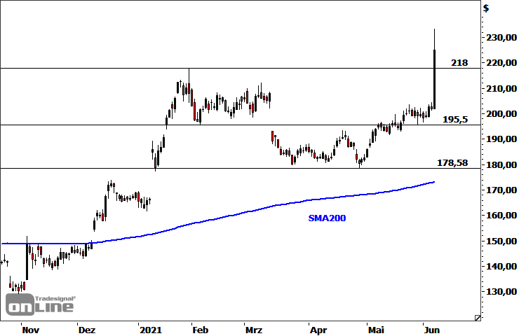 Die Aktie des Pharmakonzerns Eli Lilly and Company (WKN: 858560) weist in allen relevanten Zeitebenen einen intakten Aufwärtstrend auf. Zuletzt hatte sie ausgehend vom im Januar markierten Rekordhoch bei 218,00 USD eine Korrekturphase durchlaufen, die sie bis auf ein im April gesehenes 3-Monats-Tief bei 178,58 USD zurückführte. Seither tendiert der Kurs wieder nordwärts. Im gestrigen Handel beförderten die Bullen das Papier begleitet von extrem hohen Umsätzen um zwischenzeitlich 15,50 Prozent nach oben bis auf ein neues Rekordhoch bei 233,33 USD. Am dort befindlichen Fibonacci-Zielcluster setzten moderate Gewinnmitnahmen ein. Dabei konnte sich der Wert deutlich über der alten Bestmarke vom Januar halten. Potenzielle nächste Kursziele oberhalb der aktuellen Hürde bei 233,06-233,45 USD befinden sich bei 242,36 USD, 257,42 USD und 267,37 USD. Mögliche Auffangbereiche im Falle eines Rücksetzers lassen sich bei 218,00 USD, 213,50 USD und 195,50-201,83 USD ausmachen. Unterhalb der letztgenannten Zone käme es zu einer signifikanten Eintrübung der kurz- bis mittelfristigen technischen Ausgangslage und es müsste ein Test der übergeordnet bedeutsamen Supportzone bei aktuell 173,27-178,58 USD eingeplant werden.