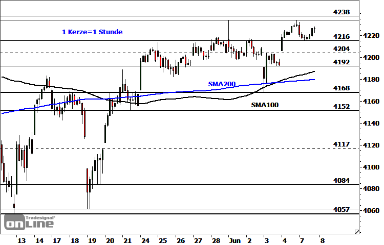 An der charttechnischen Ausgangslage ergeben sich keine relevanten Veränderungen. Die Bullen attackieren erneut die Hürde, die sich aus dem Rekordhoch vom 7. Mai und dem 3-Wochen-Hoch vom 1. Juni ergibt. Der Trend weist aufwärts. Ein nachhaltiger Ausbruch über 4.238 Punkte, insbesondere per Tagesschluss, wäre als bullishes Anschlusskaufsignal zu werten. Potenzielle nächste Ziele lauten im Erfolgsfall 4.252-4.259 Punkte, 4.275 Punkte, 4.287/4.307 Punkte, 4.350 Punkte und 4.419 Punkte. Nächste Unterstützungen befinden sich aktuell bei 4.216 Punkten, 4.204 Punkten, 4.187/4.192 Punkten und 4.168/4.173 Punkten. Ein nachhaltiger Rutsch unter die letztgenannte Zone würde das kurzfristige Chartbild signifikant eintrüben. Potenzielle Ziele lauten dann 4.148/4.152 Punkte und 4.117-4.129 Punkte.