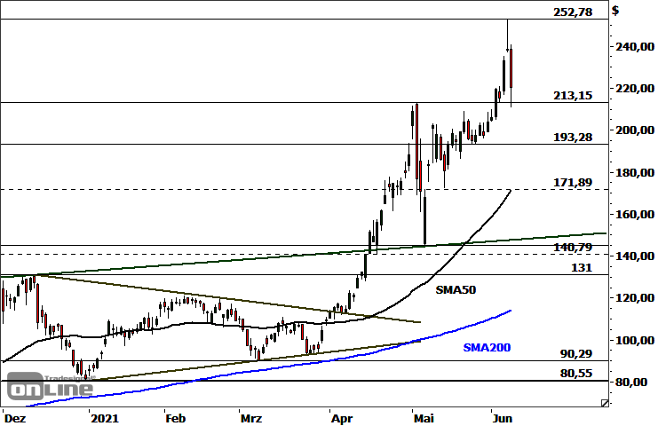 Die Aktie von BioNTech (WKN: A2PSR2) bewegt sich in allen relevanten Zeitebenen in einem intakten Aufwärtstrend. Der Wert hatte mit dem Ausbruch aus einem symmetrischen Dreieck am 5. April ein Kaufsignal generiert, dessen analytisches Mindestkursziel mittlerweile abgearbeitet wurde. Zuletzt ergab sich aus dem Anstieg über die Widerstandslinie entlang der mittelfristigen Hochpunkte am 16. April ein bullishes Anschlusssignal, welches eine Beschleunigung des dominanten Haussetrends indizierte. Die Rally führte die Notierung bis auf ein am Montag markiertes Rekordhoch bei 252,78 USD. Die bearishe Aussage der darunter geformten Doji-Kerze wurde gestern mit einem deutlichen Kursrutsch bestätigt, was zur Komplettierung eines ebenfalls bearishen Evening Doji Star führte. Im Fokus steht nun die aktuelle Unterstützungszone bei 203,91-213,15 USD. Solange diese nicht nachhaltig unterboten wird, kann der laufende Rücksetzer noch als klassischer Pullback an das Ausbruchsniveau des vorausgegangenen mittelfristigen Konsolidierungsmusters gewertet werden. Deutlicher eintrüben würde sich das technische Bild jedoch unterhalb von 193,28 USD. In diesem Fall wäre eine ausgedehnte Korrektur mit möglichen Zielen bei 171,89 USD und eventuell 140,79-150,00 USD einzuplanen. Zu einem prozyklischen Anschlusskaufsignal käme es nun mit einem Tagesschluss über der Hürde bei 252,78/255,27 USD. Im Erfolgsfall würde das Extensionsziel bei 281,30 USD in den Fokus rücken.