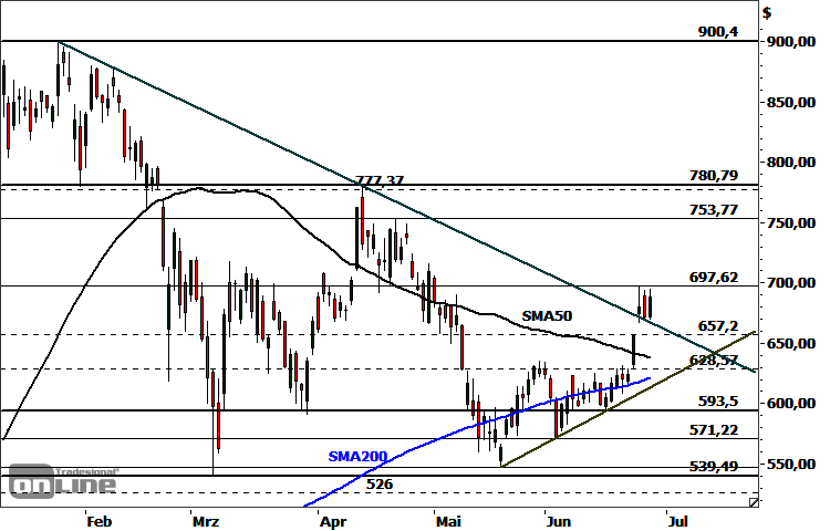 Die Tesla-Aktie (WKN: A1CX3T) weist einen intakten langfristigen Aufwärtstrend auf. Vom im März 2020 verzeichneten Crash-Tief bei 70,10 USD haussierte das Papier des Elektroautobauers in der Spitze um rund 1.184 Prozent. Ausgehend vom am 25. Januar markierten Rekordhoch bei 900,40 USD, befindet sich der Wert im Korrekturmodus. In fünf Wellen rutschte er bis auf ein im März erreichtes 4-Monats-Tief bei 539,49 USD ab. Einer Erholungsrally bis auf 780,79 USD folgte ein erneuter erfolgreicher Test des März-Tiefs. Seit einigen Wochen bewegt sich die Notierung wieder nordwärts. Am 23. und 24. Juni generierte die Aktie bullishe Ausbruchssignale. Sie überwand dynamisch das Zwischenhoch bei 635,72 USD, die 50-Tage-Linie sowie die Abwärtstrendlinie vom Rekordhoch und riss dabei begleitet von hohem Handelsvolumen zwei bullishe Kurslücken. Seither konsolidiert der Wert auf der überwundenen Trendlinie seitwärts. Ein Tagesschluss oberhalb des 7-Wochen-Hochs bei 697,62 USD würde den jüngsten Ausbruch bestätigen und nächste potenzielle Ziele bei 714,59/715,47 USD, 732,61 USD und 748,44-780,79 USD in den charttechnischen Fokus rücken. Ein Rutsch unter den aktuellen Support bei 667,61 USD würde ein Schließen der Lücke bei 657,20 USD und eventuell einen Test der solideren Supportzone bei 621,23-638,35 USD nahelegen. Unmittelbar bearish mit möglichem Ziel bei 539,49/546,98 USD würde es erst unterhalb von 609,01/615,54 USD.