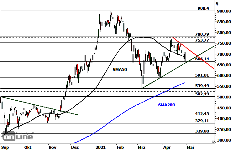 Die Tesla-Aktie (WKN: A1CX3T) weist einen intakten langfristigen Aufwärtstrend auf. Vom im vergangenen März verzeichneten Crash-Tief bei 70,10 USD haussierte das Papier des Elektroautobauers in der Spitze um rund 1.184 Prozent. Ausgehend vom am 25. Januar markierten Rekordhoch bei 900,40 USD, befindet sich der Wert im Korrekturmodus. In fünf Wellen rutschte er bis auf ein 4-Monats-Tief bei 539,49 USD ab. Es folgte eine dreiwellige Erholungsbewegung bis an ein wichtiges Ziel- und Widerstandscluster. Dort startete zuletzt bei 780,79 USD ein kurzfristiger Abwärtstrend, der die Notierung bis knapp oberhalb der Erholungstrendlinie zurückführte. Der hier am Freitag im Kerzenchart geformte Bullish Engulfing beförderte den Wert bei hohem Handelsvolumen wieder über die 50-Tage-Linie. Der Support bei aktuell 660,71-666,14 USD ist nun kritisch. Ein Tagesschluss darunter würde die Wahrscheinlichkeit für eine zweite mittelfristige Abwärtswelle mit nächsten potenziellen Zielen bei 609,78 USD, 567,45-591,01 USD und 539,49 USD deutlich erhöhen. Oberhalb der aktuellen Unterstützung bleibt hingegen die bullishe Aussage der Kerze vom Freitag erhalten. Bullishe Anschlusssignale entstünden nun mit einem nachhaltigen Anstieg per Tagesschluss über die kurzfristige Abwärtstrendlinie bei aktuell 733,55 USD sowie mit einem Break über das Reaktionshoch bei 753,77 USD. Oberhalb der soliden Widerstandszone bei 777,37/780,79 USD wäre der Weg perspektivisch frei für einen erneuten Vorstoß an das Rekordhoch.