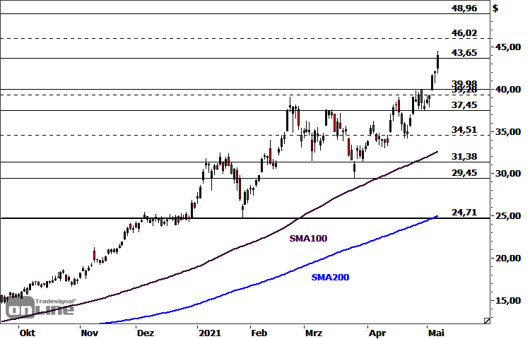 Die Aktie des Rohstoffkonzerns Freeport-McMoRan (WKN: 896476) hatte im November vergangenen Jahres mit dem Anstieg über den Widerstand bei 20,25 USD eine mehrjährige Bodenbildung in Gestalt eines Doppelbodens vervollständigt. Zuletzt hatte das Papier eine mehrwöchige Korrekturphase unterhalb eines Rallyhochs bei 39,10 USD beendet und mit der Überwindung des Hochs ein bullishes Anschlusssignal generiert. Am Freitag verzeichnete es ein 9-Jahres-Hoch bei 44,50 USD. Damit befindet sich der Wert in einer bedeutenden Zielzone, die sich bis 46,02 USD erstreckt. Darüber (Tagesschlusskursbasis) entstünde unmittelbares Anschlusspotenzial in Richtung 48,96 USD. Aus dem ultralangfristigen Chart lassen sich oberhalb der letztgenannten Marke erst im Bereich 56,78-63,62 USD wieder historische Widerstände ableiten. Mit Blick auf die derzeit überhitzten markttechnischen Indikatoren erscheint jederzeit eine Verschnaufpause möglich. Potenzielle Rücksetzer sollten spätestens in der Supportzone bei 37,45-39,98 USD auf Nachfrage treffen, um die Vorherrschaft der Bullen nicht zu gefährden. Darunter würde eine ausgeprägte mittelfristige Korrekturphase wahrscheinlich.