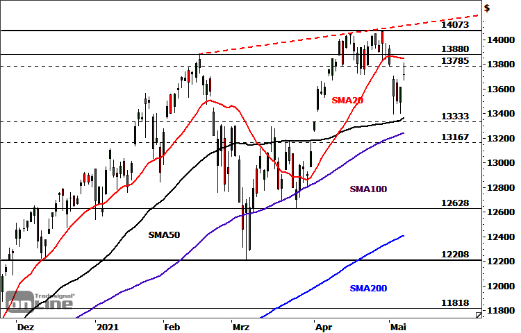 Der Nasdaq 100 hatte nach dem Rutsch aus der unterhalb des Rekordhochs etablierten mehrwöchigen Trading-Range bei 13.396 Punkten am Dienstag einen Boden ausgebildet, der am Donnerstag nach einer Zwischenerholung einem erfolgreichen erneuten Test unterzogen worden war. Mit dem Kurssprung am Freitag schloss der Index die Kurslücke vom Dienstag (13.785) und erreichte Intraday ein 4-Tages-Hoch bei 13.815 Punkten. Ausgehend vom dort befindlichen 61,8%-Fibonacci-Retracement setzten Gewinnmitnahmen ein.