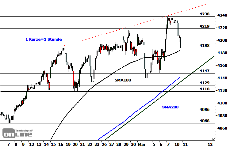 Die Fragilität des weiterhin intakten Aufwärtstrends bleibt auffällig. Saisonalität, Marktbreite und Sentiment sind derzeit Belastungsfaktoren für den Aufschwung. Sollte die erreichte Supportzone bei 4.184-4.188 Punkten unterschritten werden, was angesichts der vorbörslichen Indikation zu erwarten ist, würde die kritische Unterstützungszone bei aktuell 4.117-4.147 Punkten erneut in den charttechnischen Fokus rücken. Sie resultiert unter anderem aus den letzten Reaktionstiefs, der steigenden 200-Stunden-Linie, der Aufwärtstrendlinie vom März-Tief sowie dem 23,6%-Fibonacci-Retracement der Rally von diesem Tief. Eine nachhaltige Verletzung dieses Supports würde ein deutliches Warnsignal für die Bullen darstellen. Der Beginn einer Korrekturphase mit möglichen nächsten Zielen bei 4.086/4.091 Punkten, 4.068 Punkten, 4.041/4.046 Punkten und 4.021 Punkten wäre dann einzuplanen. Mit Blick auf die Oberseite verfügt der Index über nächste Hürden bei 4.219/4.220 Punkten und 4.238-4.253 Punkten. Darüber würde eine unmittelbare Ausdehnung der Rally bis 4.275 Punkte möglich.