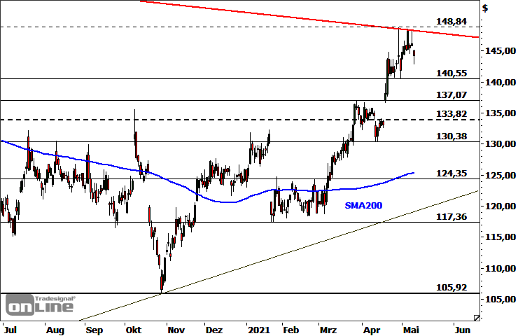 Die IBM-Aktie (WKN: 851399) bewegt sich ausgehend vom im Jahr 2013 bei 215,90 USD markierten Rekordhoch in einem ganz langfristigen Abwärtstrend. Im Rahmen des Corona-Crashs brach sie, bis auf ein im März verzeichnetes 11-Jahres-Tief, bei 90,56 USD ein. Es folgte eine erste Erholungswelle, die die Notierung bis auf 135,88 USD ansteigen ließ. Nach einem Rücksetzer bis auf 105,92 USD läuft aktuell eine zweite Welle aufwärts. Nach dem Erreichen eines 14-Monats-Hochs bei 148,74 USD Ende April konsolidiert der Wert aktuell am dort befindlichen Kreuzwiderstand aus langfristiger Abwärtstrendlinie vom Rekordhoch und Kurslücke vom 24. Februar 2020. Die kurzfristige Ausgangslage erscheint nun neutral. Bullishe Anschlusssignale im Rahmen des übergeordneten Aufwärtstrends entstünden mit einem Anstieg per Tagesschluss über die Marken 148,84 USD und 151,11 USD. Dann würde das Mehrjahreshoch aus dem Jahr 2020 bei 158,75 USD als langfristig kritische Hürde wieder in den Fokus rücken. Ein Rutsch unter den aktuellen Support bei 140,55-141,88 USD würde hingegen für einen Übergang in eine deutlichere Abwärtskorrektur sprechen. Als potenzielles Korrekturziel fungiert in diesem Fall die Zone 133,82-137,07 USD. Kann sich die Aktie spätestens dort stabilisieren, bleibt das mittelfristige Chartbild konstruktiv für einen anschließenden zeitnahen erneuten Vorstoß an die aktuelle Hürde.
