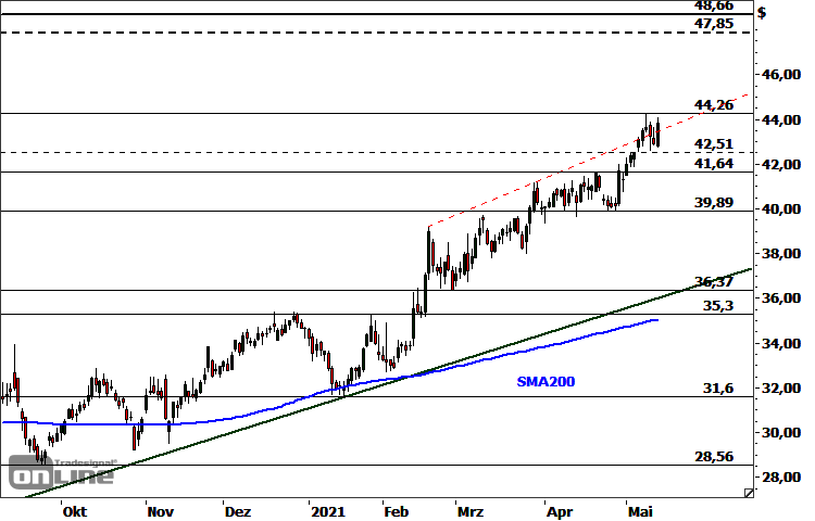 Die Aktie der Kraft Heinz Company (WKN: A14TU4) hatte ausgehend vom im Jahr 2017 bei 97,77 USD markierten Rekordhoch einen Bärenmarkt gestartet, der die Notierung bis auf ein im März vergangenen Jahres erreichtes Allzeittief bei 19,99 USD zurückwarf. Das Kursgeschehen oberhalb dieses Tiefs kann als langfristige Bodenbildung gewertet werden. Zum Wochenstart kletterte der Wert auf ein 2-Jahres-Hoch bei 44,26 USD und leitete mit einer Shooting-Star-Kerze eine Verschnaufpause ein. Ein Tagesschluss oberhalb des Hochs würde ein prozyklisches Anschlusskaufsignal generieren. Mittelfristig erscheint ein Vorstoß an die wichtige Widerstandszone bei 47,85/48,66 USD möglich. Darüber befinden sich potenzielle Hürden bei 50,41 USD, 54,87 USD und 64,99 USD. Mit Blick auf die Unterseite würde ein Tagesschluss unterhalb der Unterkante der Kurslücke bei 42,51 USD einen ersten Hinweis für eine ausgedehnte Konsolidierung oder Korrektur liefern. Mögliche Auffangbereiche lauten dann 41,64 USD und 39,89/40,44 USD. Darunter wäre ein Rücksetzer in Richtung der mittelfristig bedeutsamen Supportzone bei aktuell 35,30-36,37 USD einzuplanen.