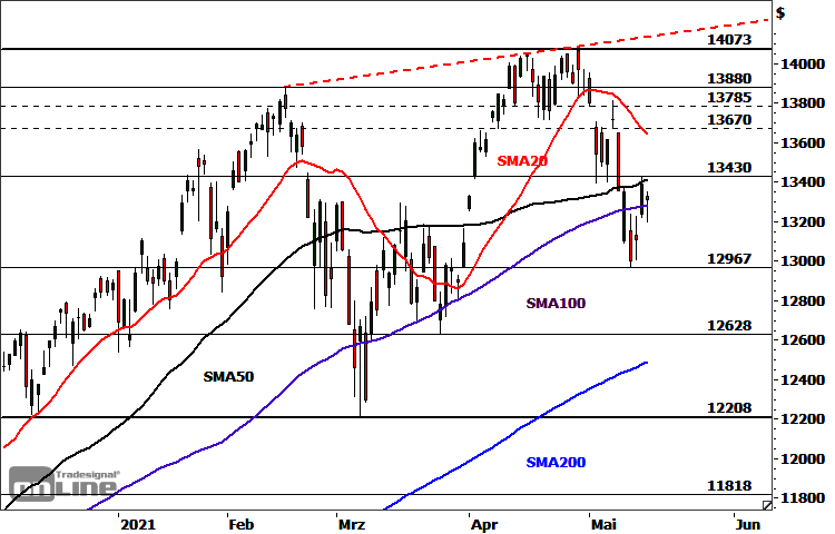 Der Nasdaq 100 konnte sich von der am Mittwoch erreichten Unterstützung bei 12.967 Punkten deutlich erholen und dabei die überverkaufte Situation in den markttechnischen Indikatoren abbauen. In drei Wellen arbeitete er sich an die Widerstandszone bei rund 13.400 Punkten hinauf und markierte am Freitag bei 13.430 Punkten ein 5-Tages-Hoch. Dort prallte die Notierung ab und rutschte im Verlauf des Montages bis auf 13.197 Punkte hinab. Dank einer deutlichen Erholung vom Tagestief schloss der Index bei 13.313 Punkten.