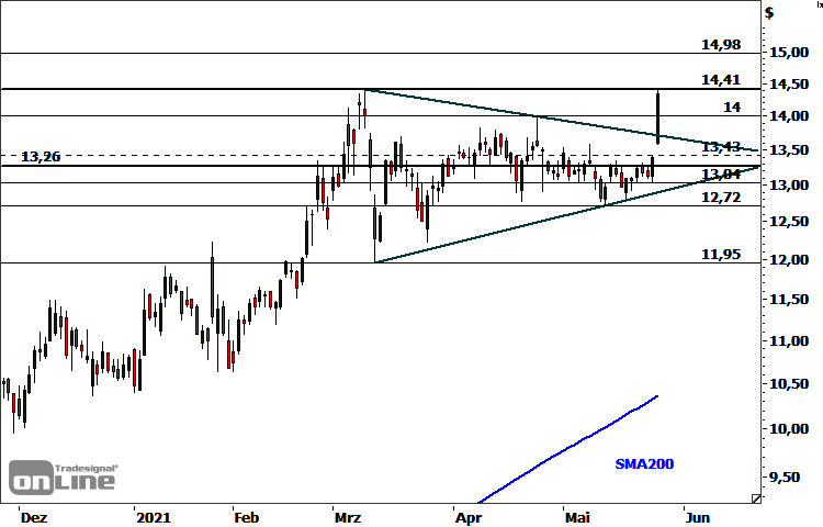 Die Aktie von General Electric (WKN: 851144) weist einen intakten ultralangfristigen Abwärtstrend auf. Das Allzeithoch des einst nach Marktkapitalisierung wertvollsten börsennotierten Unternehmens stammt aus dem Jahr 2000 und lag bei 58,14 USD. Im Rahmen der Finanzmarktkrise war das Papier bis zum Jahr 2009 auf ein Tief bei 5,51 USD eingebrochen. Nach einer bis 2016 andauernden zyklischen Zwischenhausse bis auf 31,71 USD übernahmen die Bären wieder das Ruder und drückten die Notierung bis auf 5,48 USD und damit ganz knapp unter das Finanzmarktkrisentief. Die Verletzung dieses Supports im Mai vergangenen Jahres erwies sich jedoch als Bärenfalle. Nach einer dynamischen Erholung bis auf 8,57 USD und einem ausgeprägten Rücksetzer bis auf 5,93 USD läuft aktuell ein zweiter dynamischer Aufwärtsimpuls, der zum Bruch des zyklischen Baissetrends vom Hoch im Jahr 2016 führte. Nach dem Erreichen eines 3-Jahres-Hochs bei 14,41 USD am 9. März dieses Jahres startete eine Seitwärtskorrektur in Gestalt eines symmetrischen Dreiecks. Im gestrigen Handel konnte die Aktie schließlich begleitet von einem extrem hohen Handelsvolumen und nach einer bullishen Kurslücke die obere Begrenzungslinie des Dreiecks überwinden. Das technische Bias bleibt unmittelbar bullish, solange die Supportzone bei 13,04-13,26 USD nicht unterschritten wird. Idealerweise sollten mögliche Rücksetzer jedoch bereits bei 13,43-13,72 USD auf Kaufinteresse treffen. Mit Blick auf die Oberseite befinden sich potenzielle nächste Ziele und Hürden oberhalb von 14,41 USD bei 14,71 USD, 14,98 USD, 15,38 USD und 16,23 USD.