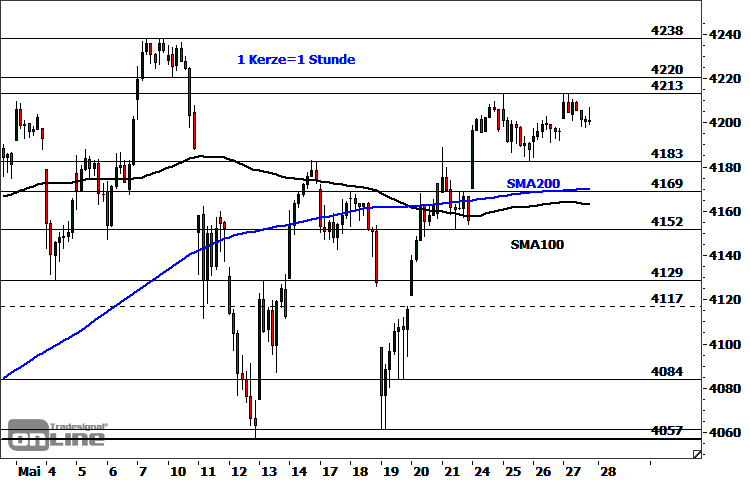 Der S&P 500 konnte seinen mehrtägigen Aufwärtstrend innerhalb der übergeordneten Stauzone bis auf ein 2-Wochen-Hoch bei 4.213 Punkten fortsetzen. Nach einem Rücksetzer auf 4.183 Punkte und einem erneuten Vorstoß an das Hoch, prallte der Index gestern ein weiteres Mal an dieser Hürde ab.