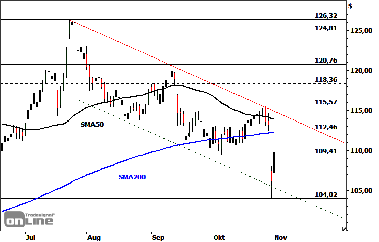 Die Aktie der Kaffeehauskette Starbucks (WKN: 884437) war ausgehend vom Corona-Crash-Tief im März 2020 bei 50,02 USD dynamisch bis auf ein im Juli dieses Jahres gesehenes Rekordhoch bei 126,32 USD angestiegen. Seither etablierte sie einen mittelfristigen Korrekturtrend, der weiterhin intakt ist. Anlässlich der Veröffentlichung der Quartalszahlen sackte das Papier am vergangenen Freitag bis auf ein 7-Monats-Tief bei 104,02 USD ab. Die dort gestartete kräftige Erholungsrally beförderte die Notierung bis gestern wieder über das letzte Reaktionstief bei 109,41 USD. Eine Ausdehnung der Erholung in Richtung der beiden nächsten Widerstandsbereiche 111,16 USD und 112,27-113,89 USD erscheint kurzfristig möglich. Erst darüber würde sich das Chartbild beginnen aufzuhellen. Ein erstes prozyklisches Signal für ein mögliches Ende des korrektiven Abwärtstrends entstünde mit einem Tagesschluss oberhalb von 115,57 USD. Potenzielle nächste Ziele lauten im Erfolgsfall 118,36 USD, 120,76 USD und 124,81/126,32 USD. Ein Rutsch unter das Verlaufstief bei 104,02 USD, insbesondere per Tagesschluss, würde den Abwärtstrend bestätigen und fortgesetzte Abgaben in Richtung zunächst 99,93/100,23 USD und anschließend 95,92/97,17 USD wahrscheinlich machen.