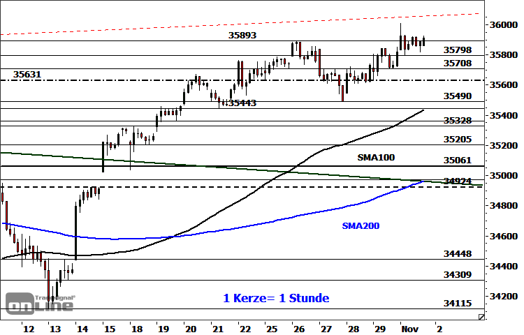 Der Dow Jones Industrial konnte sich ausgehend vom jüngsten Reaktionstief bei 35.490 Punkten bereits wieder auf ein neues Rekordhoch bei 36.010 Punkten hinaufarbeiten und konsolidierte in den letzten Handelsstunden diesen Kursaufschwung seitwärts.