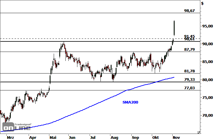 Die Aktie der Pharmazie- und Drogeriehandelskette CVS Health Corp (WKN: 859034) hatte im Jahr 2015 ein Allzeithoch bei 113,65 USD markiert. Der anschließende Bärenmarkt ließ die Notierung bis auf 51,72 USD absinken. Oberhalb dieser Marke arbeitete sie seit 2019 an einer Bodenbildung. Mit dem Kursschub im April/Mai dieses Jahres konnte dieser mehrjährige Boden schließlich komplettiert werden. Zuletzt hatte der Wert eine mehrmonatige Seitwärtskorrektur oberhalb der steigenden 200-Tage-Linie durchlaufen. Die jüngste im Oktober gestartete Kursrally beförderte ihn bis zum Dienstag knapp auf ein neues Verlaufshoch. Dieser Ausbruch wurde gestern nach der Veröffentlichung der Quartalszahlen eindrucksvoll bestätigt. Die Aktie riss eine bullishe Kurslücke und haussierte begleitet von hohem Handelsvolumen bis auf ein 5-Jahres-Hoch bei 96,57 USD. Nächste potenzielle Ziele und Hürden lauten 98,67-102,00 USD und 106,67 USD. Darüber wäre der Weg frei in Richtung Rekordhoch. Mögliche Rücksetzer sollten nun idealerweise spätestens im Bereich 90,61-92,20 USD enden, um den kurzfristigen Aufwärtstrend nicht zu gefährden. Darunter wären Abgaben in Richtung 86,59-87,79 USD oder der kritischen Supportzone bei 79,33-81,78 USD einzuplanen.