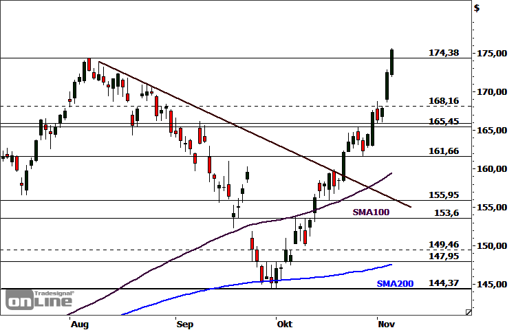 Die Aktie des weltgrößten Sportartikel-Konzerns Nike (WKN: 866993) bewegt sich in einem intakten Aufwärtstrend. Vom im März 2020 verzeichneten Crash-Tief bei 60,00 USD konnte sie sich V-förmig erholen und das alte Rekordhoch vom Januar 2020 bei 105,62 USD bereits sieben Monate später überwinden. Eine korrektive mehrmonatige Trading-Range wurde im Juni in Reaktion auf überraschend positive Quartalszahlen mit einer riesigen Kurslücke nach oben verlassen. Dieses bedeutende Anschlusskaufsignal beförderte die Notierung innerhalb weniger Wochen bis auf eine neue historische Bestmarke bei 174,38 USD. Die hierbei entstandene überkaufte markttechnische Ausgangslage wurde im Anschluss im Rahmen eines korrektiven Abwärtstrends abgebaut. Auf dem Supportcluster bestehend aus 200-Tage-Linie und 61,8%-Fibonacci-Retracement meldeten sich die Käufer Anfang Oktober zurück. Der seither laufende dynamische Kursanstieg beförderte den Anteilsschein schließlich im gestrigen Handel auf eine neue historische Bestmarke. Kann sich die Aktie per Tagesschluss oberhalb von 174,38 USD halten, könnte die nächste potenzielle Zielzone 182,54-185,84 USD zügig angesteuert werden. Darüber befindet sich ein plausibles Ausdehnungsziel bei 192,05/192,93 USD. Ein signifikanter Tagesschluss unter 174,38 USD würde hingegen zunächst für eine Konsolidierung der jüngsten Rally oder einen Rücksetzer in Richtung 168,16 USD, 165,45/165,89 USD oder 161,66 USD sprechen.