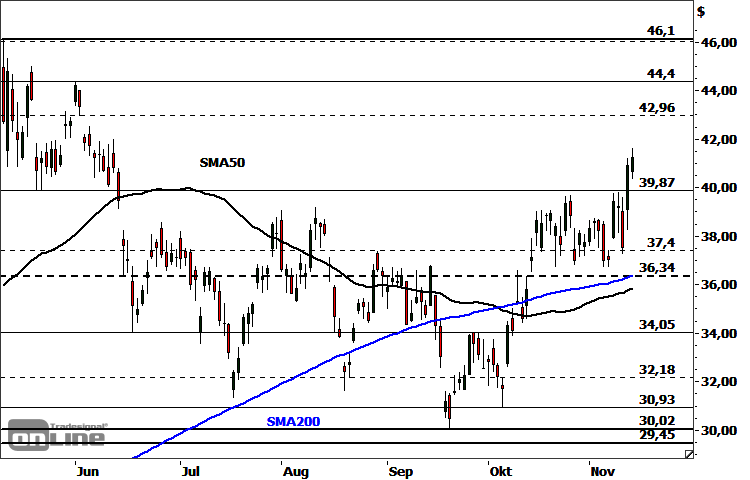 Die Aktie des Rohstoffkonzerns Freeport-McMoRan (WKN: 896476) hatte im November vergangenen Jahres mit dem Anstieg über den Widerstand bei 20,25 USD eine mehrjährige Bodenbildung in Gestalt eines Doppelbodens vervollständigt. Sie kletterte bis auf ein im Mai verzeichnetes 9-Jahres-Hoch bei 46,10 USD bevor eine Korrekturphase startete. Oberhalb des Korrekturtiefs bei 30,02 USD arbeitete der Wert an einer Bodenbildung. Am Donnerstag brach er aus einer mehrwöchigen Konsolidierung an der bedeutenden Hürde bei 39,16-39,96 USD nach oben aus und markierte ein 5-Monats-Hoch. Solange die Unterstützungszone bei 35,84-36,75 USD nicht per Tagesschluss verletzt wird, bleibt das mittelfristige Chartbild bullish zu werten. Ein Warnsignal für ein erneutes Ansteuern dieser kritischen Supportzone wäre in einem Rutsch unter 38,27/38,54 USD zu sehen. Mit Blick auf die Oberseite befinden sich nächste Widerstände und potenzielle Ziele bei 41,98/42,31 USD, 42,96 USD, 44,40 USD und 45,07-46,10 USD. Darüber würde der primäre Aufwärtstrend bestätigt mit nächstem Ziel bei 48,20-48,96 USD.