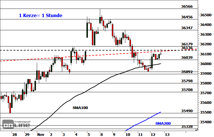 Zu einer Aufhellung des kurzfristigen Chartbildes bedarf es nun eines nachhaltigen Anstieges über die aktuelle Hürde bei 36.100-36.179 Punkten per Stundenschluss. Im Erfolgsfall würden potenzielle Widerstände bei 36.317/36.347 Punkten, 36.412/36.456 Punkten und 36.566 Punkten in den charttechnischen Fokus rücken. Ein Break über die letztgenannte Marke würde schließlich den primären Aufwärtstrend bestätigen mit möglichen nächsten Zielen bei 36.743 Punkten, 36.814 Punkten und 36.878/36.911 Punkten. Der Blick auf die Unterseite enthüllt nächste Supportbereiche bei 36.039 Punkten, 35.987-36.001 Punkten und aktuell 35.879-35.915 Punkten. Eine Verletzung der Marke von 35.879 Punkten würde eine weitere korrektive Abwärtswelle in Richtung 35.798 Punkte, 35.708 Punkte und 35.490-35.630 Punkte nahelegen.