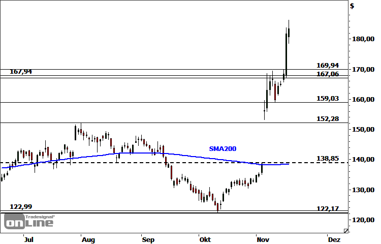 Die Aktie des US-Chipkonzerns Qualcomm (WKN: 883121) hatte im Rahmen des Corona-Crashs im März 2020 ein 11-Monats-Tief bei 58,00 USD markiert. Die folgende dynamische Rally beförderte die Notierung bis auf ein im Januar verzeichnetes Allzeithoch bei 167,94 USD. Im Anschluss etablierte der Wert eine Stauzone oberhalb eines Korrekturtiefs bei 122,17 USD. Diese Trading-Range konnte schließlich am Dienstag signifikant nach oben aufgelöst werden. Die Aktie schraubte sich bis gestern auf eine neue Bestmarke bei 186,33 USD. Das Handelsvolumen bestätigt das bullishe Preisgeschehen. Mit dem erfolgten Abarbeiten der ersten Fibonacci-Extensionsziele und angesichts der mittlerweile extrem überkauften markttechnischen Indikatoren (RSI auf Tagesbasis bei 84) käme nun eine zeitnahe Verschnaufpause alles andere als überraschend. Solange im Rahmen eines möglichen Rücksetzers der nun als Support fungierende Bereich 167-170 USD nicht nachhaltig unterschritten wird, bleiben die Bullen übergeordnet unmittelbar am Ruder. Ein Tagesschluss oberhalb von 185,43 USD würde die nächsten beiden Extensionsziele bei 196,23 USD (kurzfristig) und 213,71 USD (mittelfristig) in den charttechnischen Fokus rücken. Ein Rutsch unter 167-170 USD würde hingegen zunächst Abwärtsrisiken in Richtung 159 USD und 152 USD mit sich bringen.
