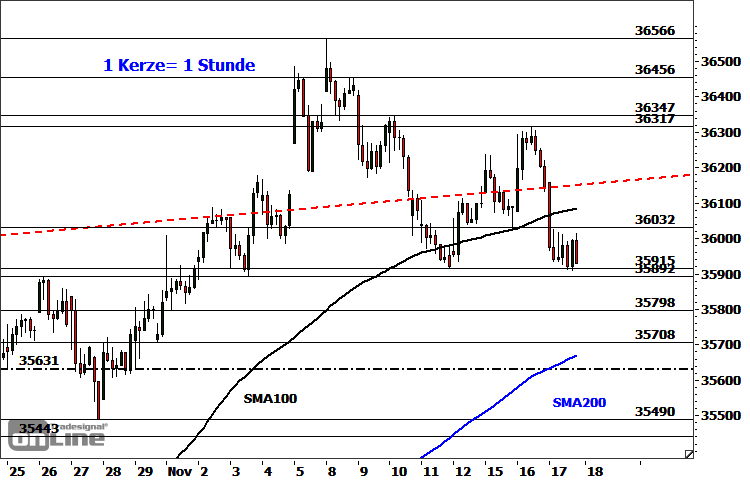 Kurzfristig kritisch ist nun die aktuelle Supportzone bei 35.892-35.915 Punkten. Eine nachhaltige Verletzung würde eine Ausdehnung und eventuell Beschleunigung des kurzfristigen Abwärtstrends wahrscheinlich machen mit möglichen nächsten Zielen und Unterstützungen bei 35.798 Punkten und 35.630-35.708 Punkten. Darunter würde sich das technische Bild weiter eintrüben mit potenziellen Zielen bei 35.490 Punkten und 35.264-35.364 Punkten. Nächste Widerstände lauten 36.032 Punkte, 36.086/36.100 Punkte und 36.161 Punkte. Ein Break über die Hürde bei 36.315/36.317 Punkten ist erforderlich, um ein zeitnahes Wiedersehen mit dem Rekordhoch bei 36.566 Punkten zu ermöglichen.