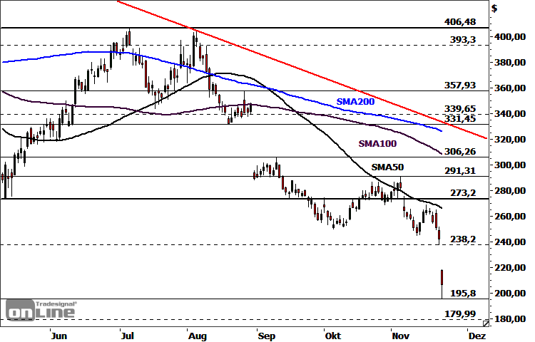 Die Aktie von Zoom Video Communications (WKN: A2PGJ2) hatte ausgehend vom Tief im Jahr 2019 bei 60,97 USD einen dynamischen Aufwärtstrend etablieren können, der die Notierung des Corona-Profiteurs bis auf ein im Oktober 2020 bei 588,84 USD markiertes Rekordhoch katapultierte. Seither prägt eine ausgeprägte Korrekturphase das Kursgeschehen. Der Wert hatte zuletzt im Dunstkreis des 61,8%-Fibonacci-Retracements einen mittelfristigen Stabilisierungsversuch unternommen. Zum Wochenstart markierte er jedoch ein neues Verlaufstief und bestätigte damit die Vorherrschaft der Bären. In Reaktion auf die Veröffentlichung negativ aufgenommener Geschäftszahlen stürzte das Papier im gestrigen Handel weiter ab und riss dabei eine bearishe Kurslücke. Ausgehend vom erreichten 17-Monats-Tief bei 195,80 USD zeigte es eine leichte Erholungsbewegung und schloss bei 206,64 USD. Der Weg des geringsten Widerstands weist weiterhin südwärts. Ein Rutsch unter das gestrige Tief würde potenzielle nächste Unterstützungen und Ziele bei 190,83/194,21 USD und 171,82-185,55 USD in den charttechnischen Fokus rücken. Mit Blick auf die überverkaufte markttechnische Situation erscheint vorgeschaltet eine technische Erholungsbewegung möglich. Potenzielle Erholungsziele lauten 222,73-224,65 USD und 232,34-240,96 USD. Solange die letztgenannte Zone nicht nachhaltig überwunden wird, bleiben die Bären auch kurzfristig im Vorteil. Deutlicher aufhellen würde sich die Ausgangslage erst mit einem Anstieg über die beiden Widerstandszonen 268,88/273,20 USD und 291,31-306,26 USD.