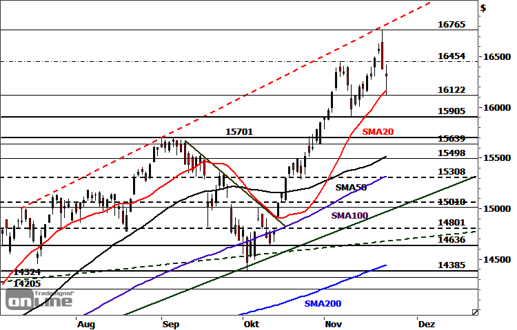 Der Index befindet sich weiterhin in einem intakten Aufwärtstrend. Eine mögliche zeitliche und preisliche Ausdehnung des laufenden Rücksetzers sollte jedoch eingeplant werden. Auf Basis des Tagescharts haben einige Indikatoren bereits Verkaufssignale nach bearisher Divergenz generiert. Die nächste Unterstützung befindet sich heute bei 16.096-16.164 Punkten. Darunter würden nächste potenzielle Abwärtsziele bei 16.013 Punkten und 15.905/15.920 Punkten aktiviert. Mit Blick auf die Oberseite verfügt der Kurs über nächste Hürden bei 16.367 Punkten, 16.443/16.461 Punkten und 16.600-16.627 Punkten. Darüber würde sich das kurzfristige technische Bild leicht aufhellen mit der Chance auf einen zeitnahen erneuten Test des Rekordhochs bei 16.765 Punkten.